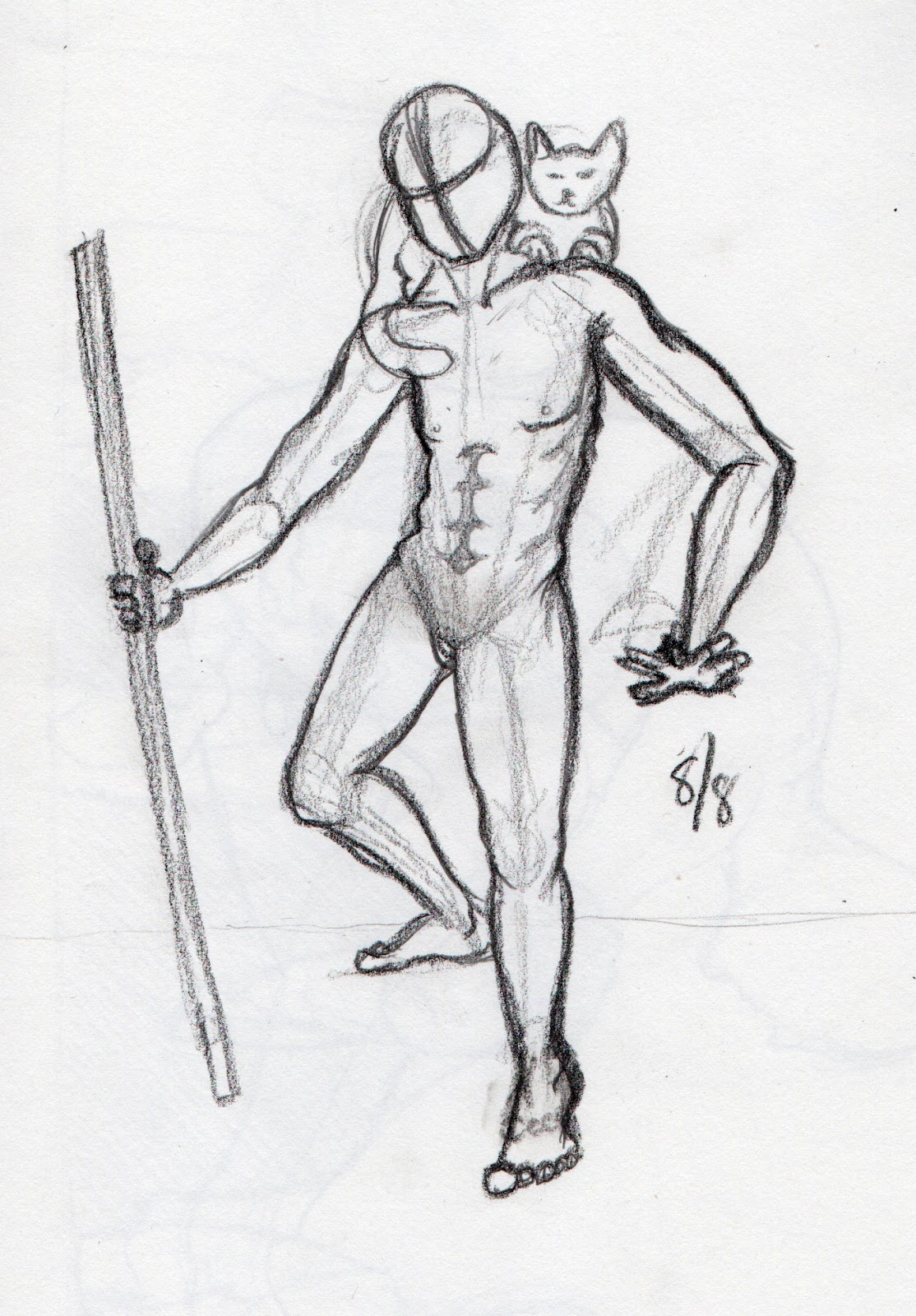 I didn't use reference so there are probably a lot of mistakes ^^;; but it was fun to do. I got this idea while watching a vlog on Youtube (I spend a lot of my time on there lol). The guy decided that if he wanted to be a superhero, he'd be one that carried a staff/long pipe with a cat sidekick xD.